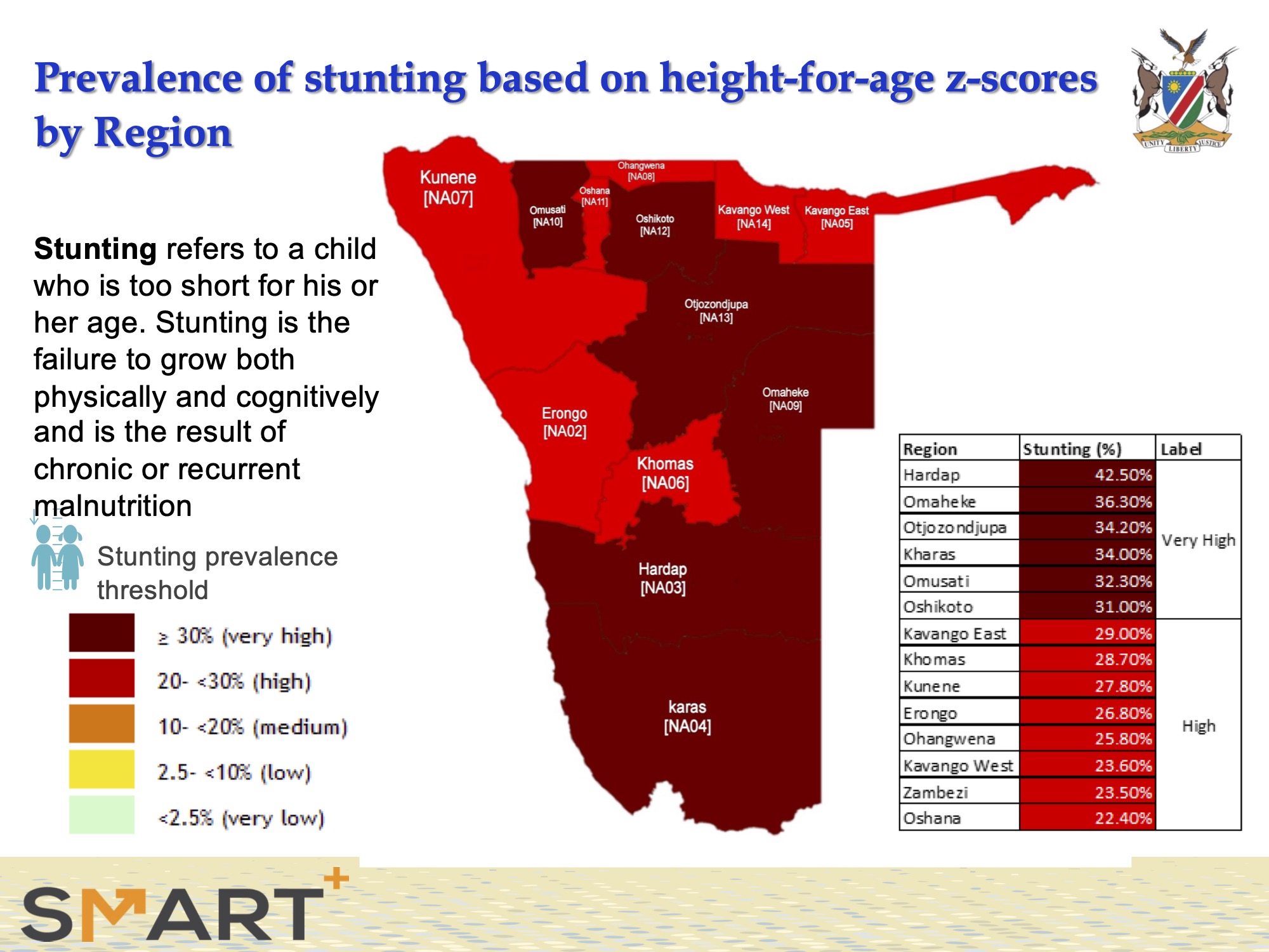 It also reveals a very concerning rise in stunting (= chronic malnutrition) from ± 24% in 2012 (Namibia Demographic and Health Survey, 2013) to ± 30% in 2024.